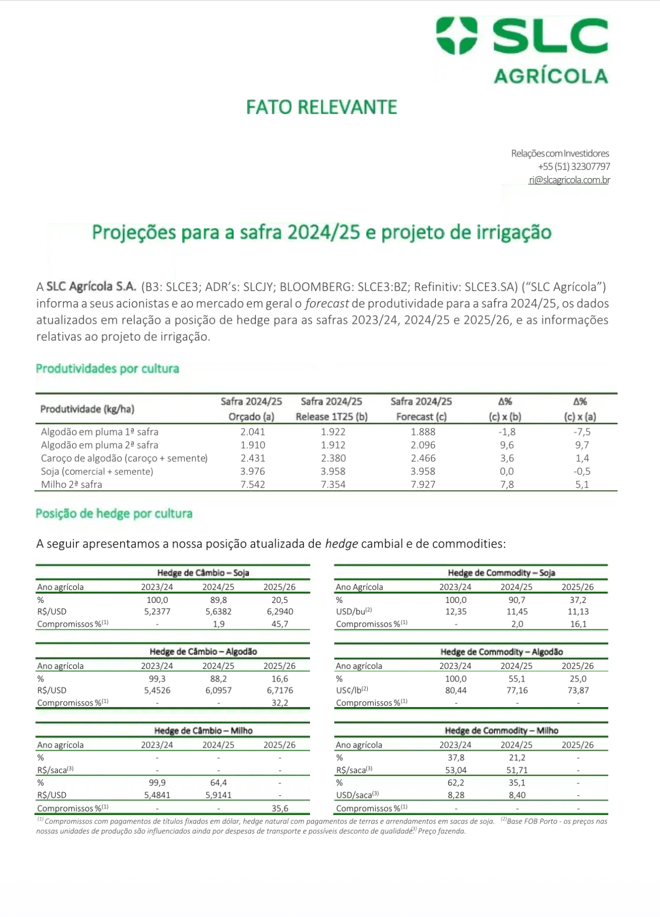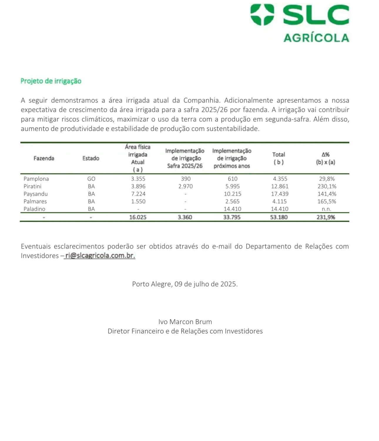 Além disso, a SLC anunciou planos ambiciosos para aumentar sua área irrigada — atualmente em 16 mil hectares — para 53 mil hectares nos próximos anos, com foco principalmente nas fazendas da Bahia . A medida visa mitigar riscos climáticos e permitir a intensificação das segundas safras, maximizando o uso da terra.