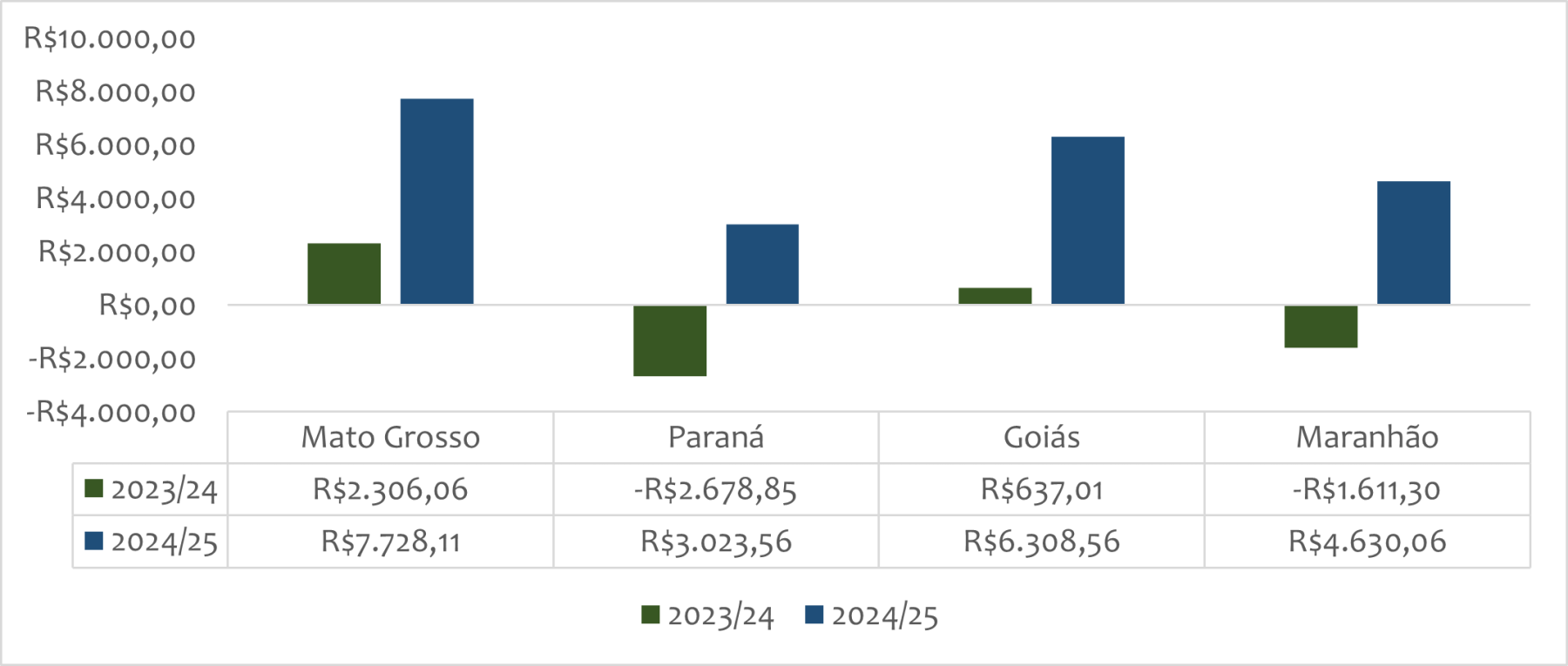 Estimativa do resultado para a produção de soja, na safra de verão, e milho, na safra de inverno, em diferentes regiões do Brasil, em R$/hectare, considerando o custo operacional efetivo (COE), como referência e o preço médio na safra 2024/25.