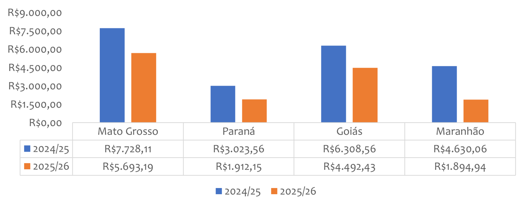 Considerando o custo operacional efetivo – não levando em conta o custo oportunidade e, consequentemente, o custo total efetivo, houve retração nas praças do Mato Grosso, Paraná, Goiás e Maranhão. Em média, o custo para a rotação soja/milho caiu 18,3% (Conab).