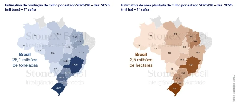 Neste levantamento, a StoneX revisou sua projeção para o milho verão 2025/26 e elevou a estimativa de produção nacional para 26,1 milhões de toneladas, aumento de 1,9% em relação ao relatório de novembro.