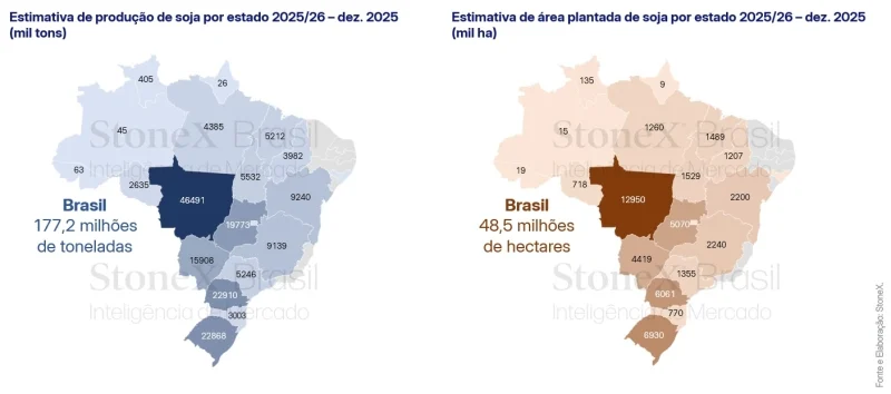 Em sua revisão mensal, a StoneX, empresa global de serviços financeiros, apresentou novos dados para a safra de soja 2025/26. Na atualização de dezembro, a consultoria ajustou para baixo a estimativa de produção nacional, agora projetada em 177,2 milhões de toneladas — ainda um recorde histórico, porém 0,9% inferior ao previsto no relatório anterior.