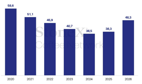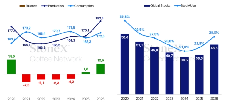 A projeção aponta para uma produção de 182,5 milhões de sacas, frente a um consumo de 172,5 milhões, permitindo a recomposição dos estoques globais para patamares acima de 48 milhões de sacas, após quatro anos consecutivos de queda até 2024 e leve recuperação em 2025.