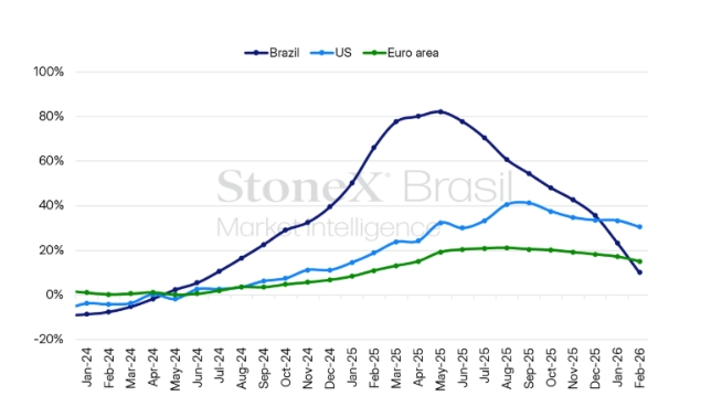 “O mercado entra em 2026 com uma perspectiva mais confortável do ponto de vista de oferta, mas ainda longe de um cenário de estabilidade. A recomposição dos estoques acontece de forma desigual porque o aumento de produção está concentrado em algumas origens, como o Brasil, enquanto regiões consumidoras relevantes ainda operam com níveis historicamente baixos”, afirma o especialista de Inteligência de Mercado da StoneX, Leonardo Rossetti.