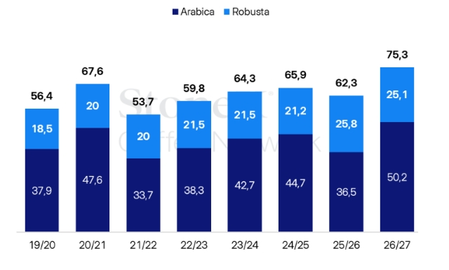 O crescimento da produção global, estimado em 9,6% na comparação anual – ante 166,5 milhões de sacas em 2025, com base em números revisados -, é puxado principalmente pelo Brasil. O país deve registrar safra recorde de 75,3 milhões de sacas em 2026/27, alta de 20,8% na comparação anual, impulsionada pela recuperação dos danos climáticos da temporada anterior e pelo avanço estrutural da produção, especialmente do café robusta.