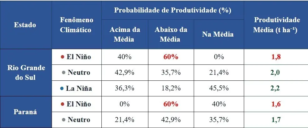 Tabela 2: Impacto do fenômeno ENOS na cultura de aveia na Região Sul do Brasil. Fonte: Dados estaduais de produtividade da aveia de 1996-2025 (CONAB).