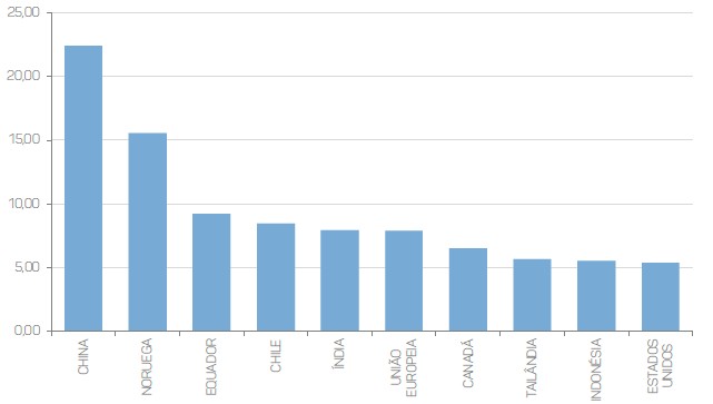 Segundo o Departamento de Agricultura dos Estados Unidos (USDA), a China e a Noruega são os maiores exportadores de pescados do mundo. Em 2022, com a exportação, os chineses faturaram US$22,4 bilhões de pescado, enquanto a Noruega faturou US$15,5 bilhões. Na sequência figuram Equador, Chile, Índia, União Europeia (UE), Canadá, Tailândia, Indonésia e Estados Unidos da América (figura 1).