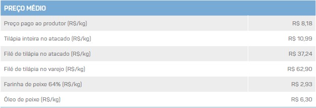 No atacado, o preço da tilápia inteira apresentou alta de 1,6%, comercializada em R$10,99/kg. A cotação do filé de tilápia teve acréscimo de 0,9%, negociado em R$37,24/kg.