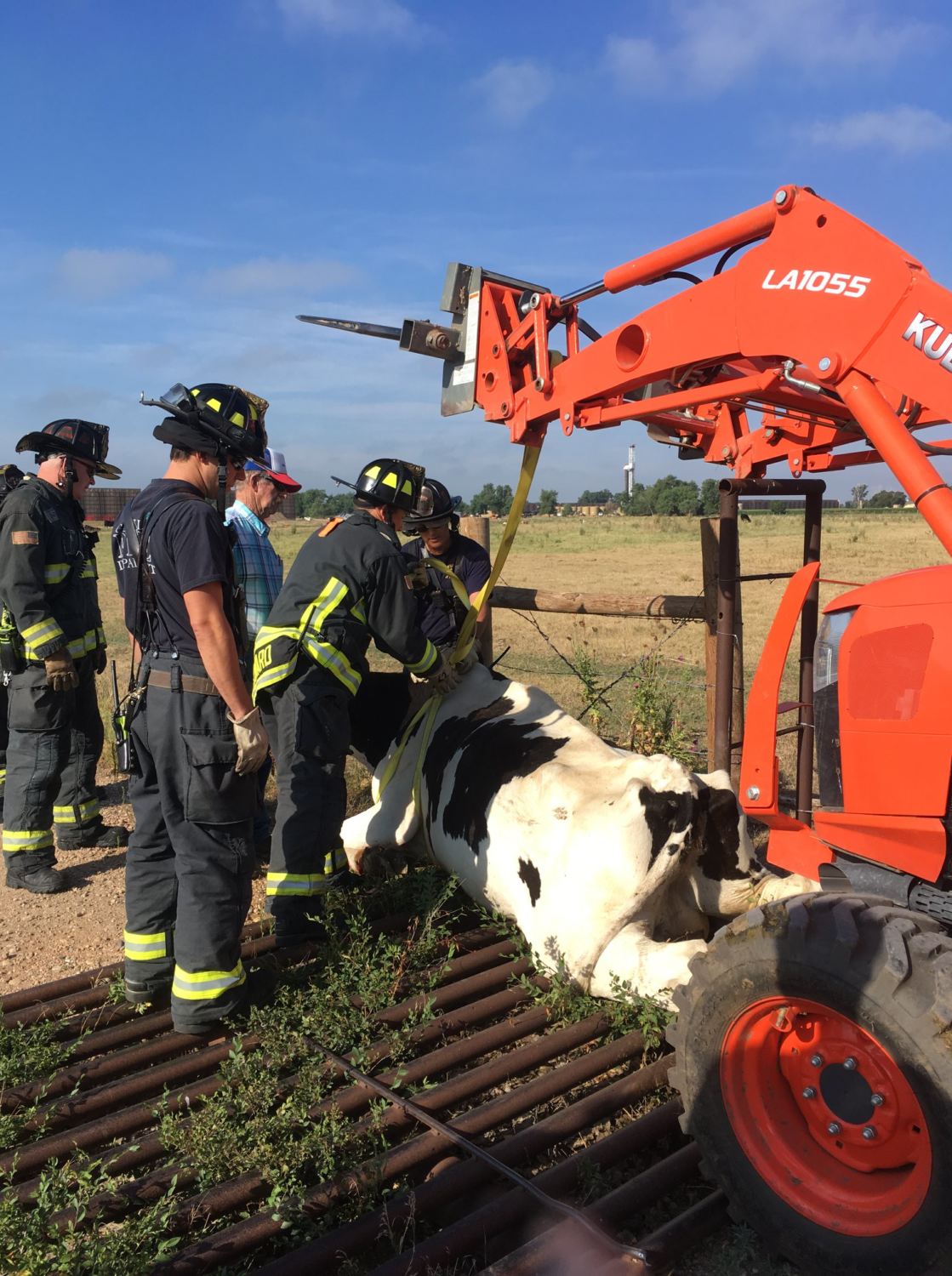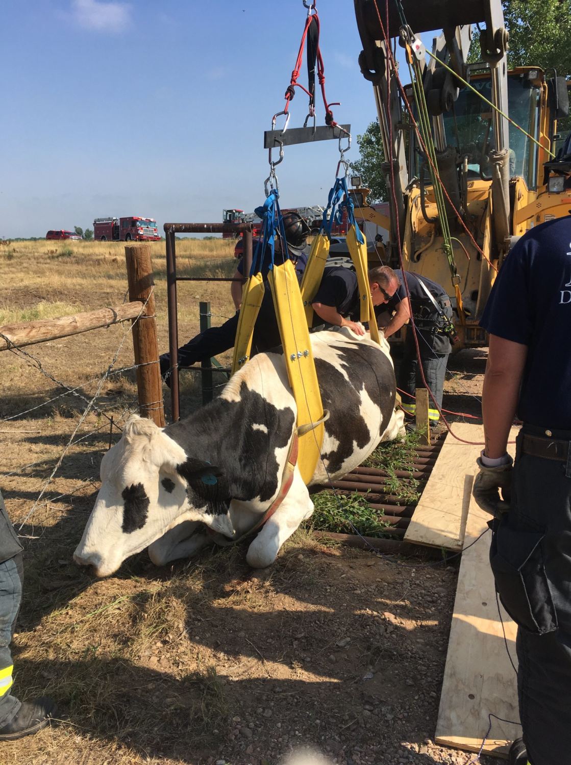 Bombeiros e agentes do departamento de Controle de Animais da polícia de Greeley, no Colorado (EUA), precisaram se unir para resgatar uma vaca em apuros. O animal ficou preso ao tentar transpor um mata-burro.