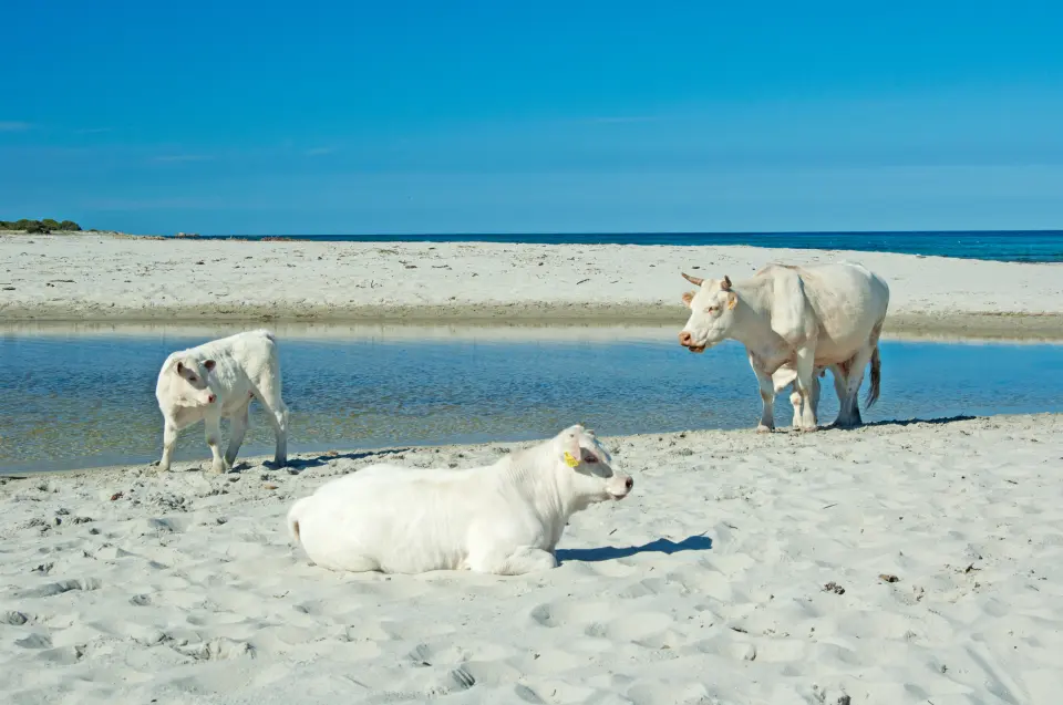 Em regiões como a Costa Verde e praias como Berchida e Piscinni, é possível encontrar vacas descansando à beira-mar, circulando entre dunas e pastagens naturais, criando um contraste curioso entre o turismo litorâneo e a vida rural.