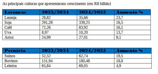 Em relação à safra 2023/2024, as lavouras tiveram aumento de 6,7%, e a pecuária avançou 9,5%.