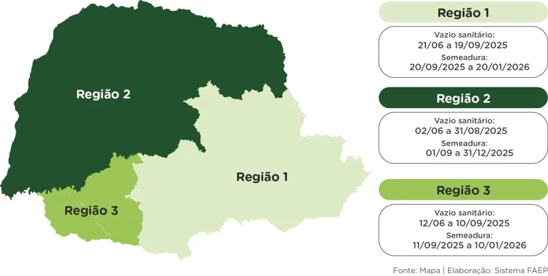 No final de abril, o Ministério da Agricultura e Pecuária (Mapa) publicou a Portaria 1.271 com as datas dos períodos de vazio sanitário e o calendário de semeadura de soja referentes à safra 2025/26 para o Brasil. No Paraná, desde a safra 2023/24, o Estado foi segmentado em três regiões, com diferentes períodos para vazio sanitário e semeadura.