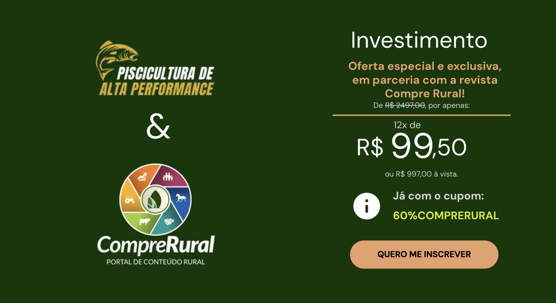O curso, que originalmente custa R$ 2.497,00, está disponível por apenas 12x de R$ 99,50 ou R$ 997,00 à vista. Clientes da Compre Rural têm um desconto exclusivo de 60% com o cupom 60%COMPRERURAL.